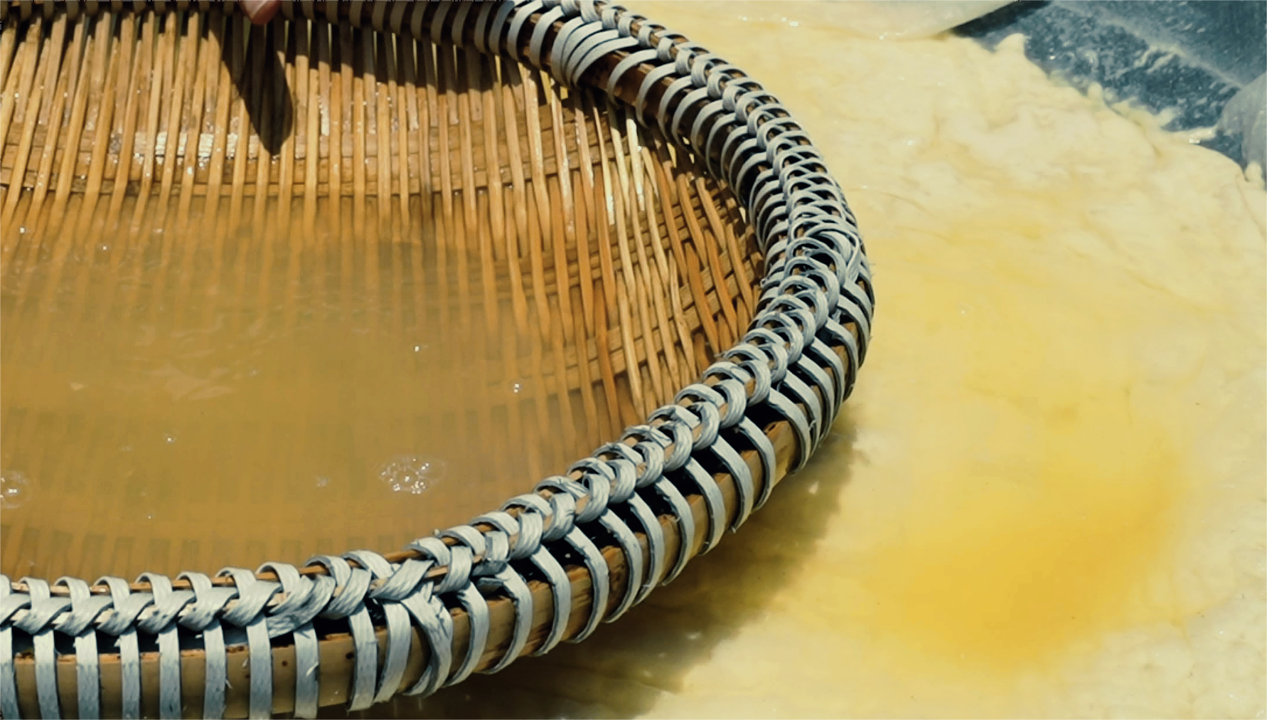 点,是实现豆浆转化为豆花的奇妙过程,点豆花人凭借多年的经验,小心控制着胆水配比,滴一会儿,停一会儿,少许胆水慢慢浸入豆浆,凝结豆浆中的蛋白质,分离其中的水分。胆水放多了,豆花会老;放少了,又会太嫩。数次滴搅后,锅里开始慢慢析出白色的絮状物质,细小豆花逐渐生成,竹编筲箕沿着锅边轻压豆花,至完全紧实,石磨豆花就算是做好了。