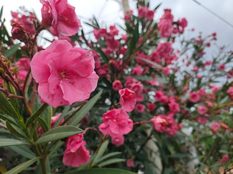 夹竹桃:“美目盼兮,巧笑倩兮。”夹竹桃如美人华冠,摇曳一树风流,静待凤凰来栖。她极易成活,既能净化空气,又美化环境,花开时绚丽芬芳,是当地群众喜爱种植的观赏植物。夹竹桃虽美,却是有毒植物,观赏时可驻足打卡拍照,切记远观莫触碰。