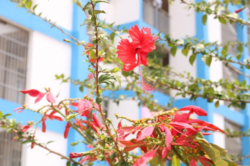南华县红土坡镇田地里的青草刚刚吐出新绿,凤凰花、三角梅、蔷薇、扶桑、夹竹桃等数种夏花争相怒放,踏着徐徐清风奏起了夏日的赞歌。